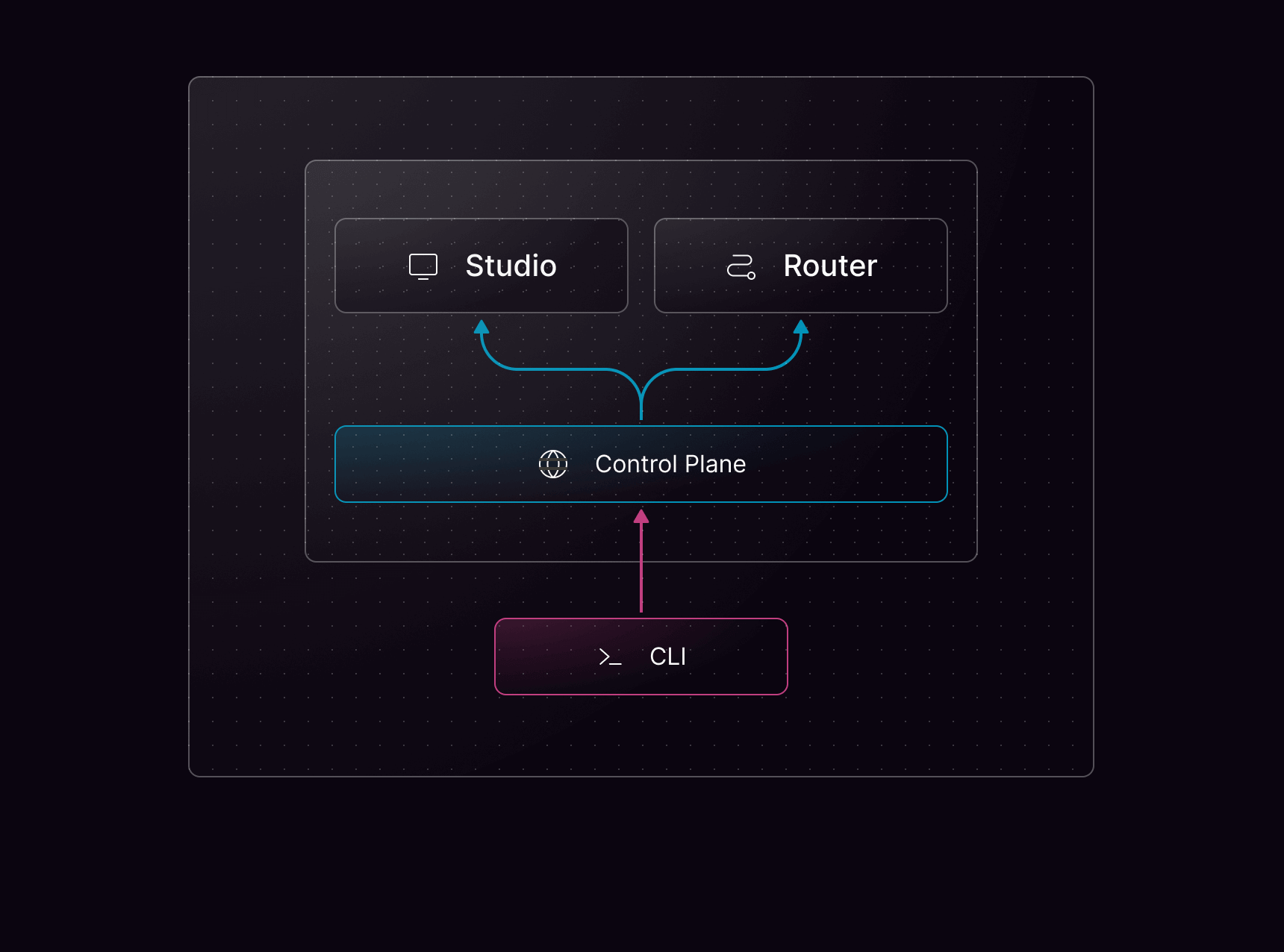 The Control Plane forms the heart of the Cosmo platform and comprises two core elements: The Platform API and the Node API. The Platform API is utilized by the Cosmo CLI tool and Studio for platform management. On the other hand, the Node API facilitates fleet-specific operations, carried out by the Router nodes.