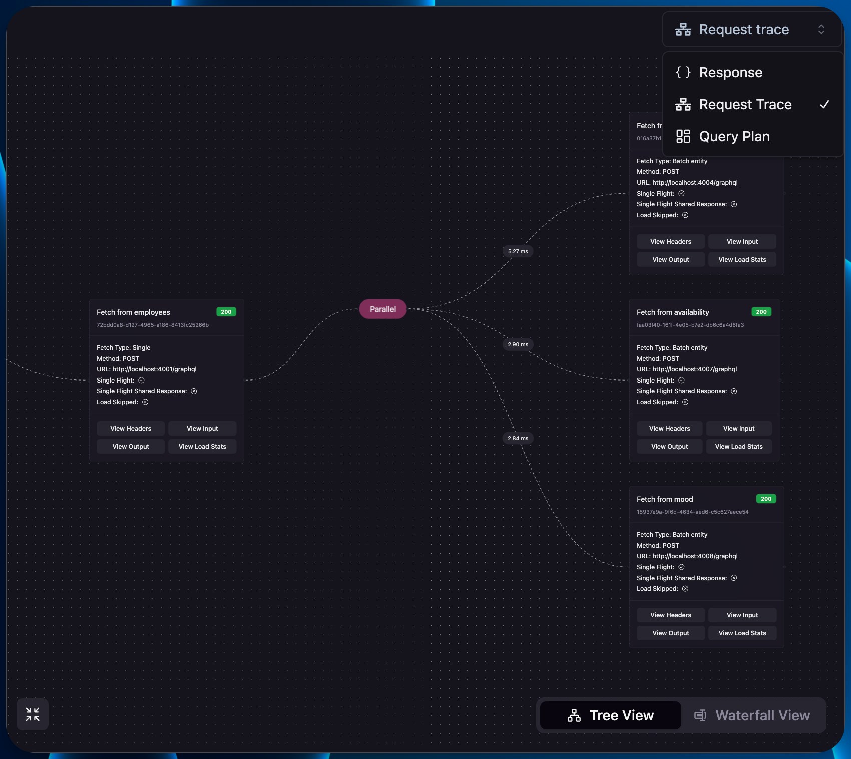 After executing the Example Query, use the dropdown on the right to see how the router processed the request and distributed it across subgraphs. Inspect the generated query plan to understand execution details, troubleshoot issues during development, and ensure optimal performance in production. If you want to learn more about it, please take a look at ART and Query Plans.